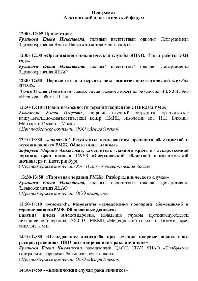 Арктический онкологический форум Дата проведения: 30 мая 2025 года Место проведения: г. Ноябрьск, ул. Республики 12, гостиница «Россия» конференц-зал Ссылка на подключение: https://my.mts-link.ru/j/66087115/124036991