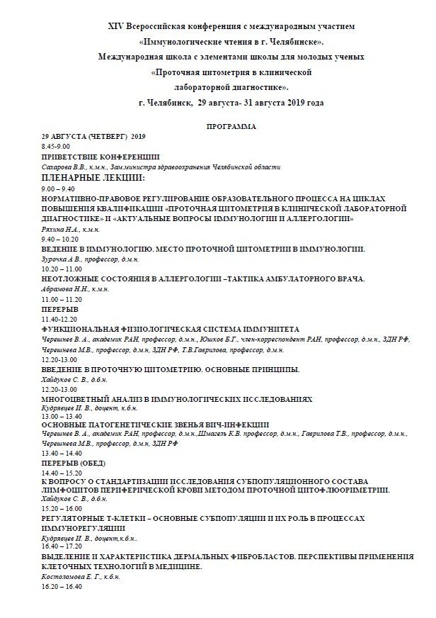 ХIV Всероссийская конференция с международным участием «Иммунологические чтения в г. Челябинске». Международная школа с элементами школы для молодых ученых «Проточная цитометрия в клинической лабораторной диагностике». |