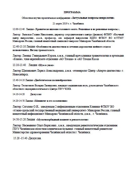 Областная научно-практическая конференция «Актуальные вопросы неврологии» Место роведения: г. Челябинск, Отель Парк-Сити, ул. Лесопарковая, 6 Дата проведения: 21 марта 2019 года