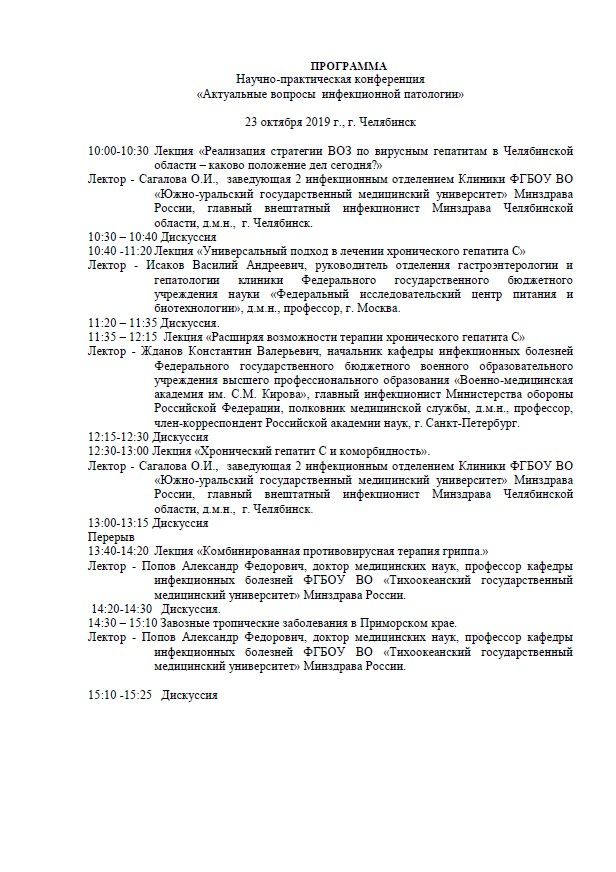 Областная научно-практическая конференция «Актуальные вопросы инфекционной патологии» Место проведения: г. Челябинск, ул. Воровского, 64,конференц-зал ЮУГМУ Дата проведения: 23 октября 2019 года