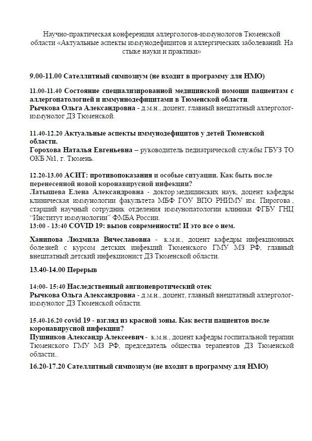 Научно-практическая конференция аллергологов-иммунологов Тюменской области «Актуальные аспекты иммунодефицитов и аллергических заболеваний. На стыке науки и практики» |