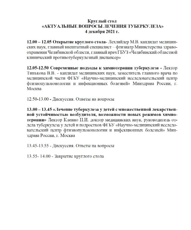 Круглый стол «Актуальные вопросы лечения туберкулеза» Дата проведения: 4 декабря 2021 года. Место проведения: г. Челябинск, ул. Лесопарковая, 6, отель «Парк-сити»
