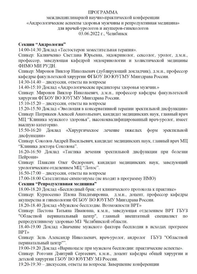 Междисциплинарная научно-практическая конференция «Андрологические аспекты здоровья мужчины и репродуктивная медицина» Дата проведения: 3 июня 2022 года. Место проведения: г. Челябинск, ул. Лесопарковая 6., отель Парксити Сателлитные симпозиумы (не входят в программу НМО)