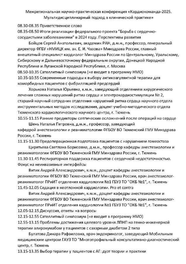 Межрегиональная научно-практическая конференция "Кардиокоманда-2025. Мультидисциплинарный подход в клинической практике" Дата проведения: 30 мая 2025 г. Место проведения: г. Тюмень, ул. Грибоедова 6 к1/7, отель "Ремезов" Сателлитный симпозиум (не входит в программу НМО)