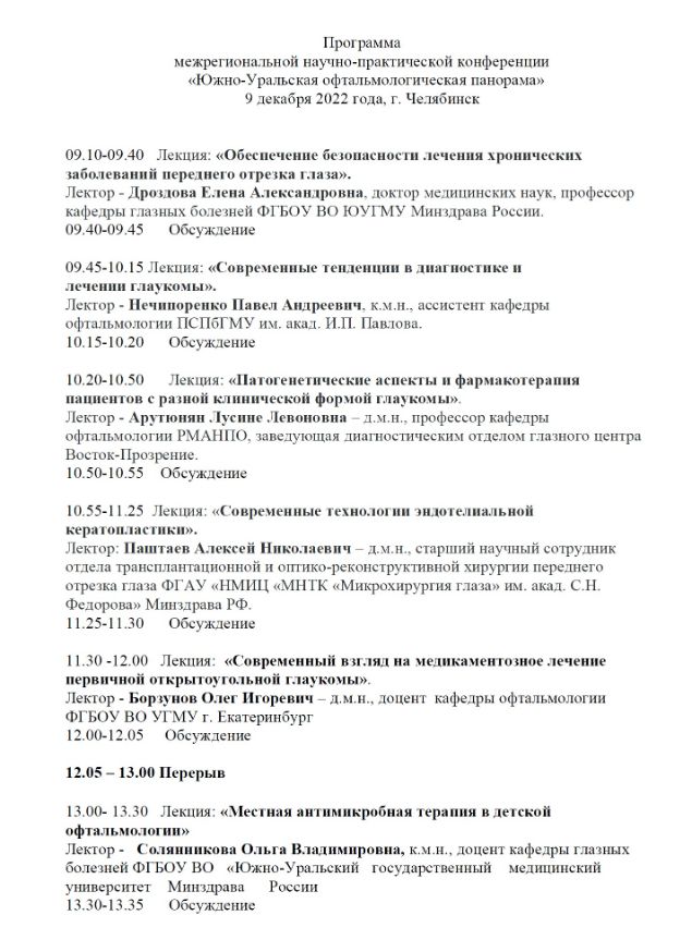 Межрегиональная научно-практическая конференция «Южно-Уральская офтальмологическая панорама» Дата проведения: 09 декабря 2022 г. Место проведения: г. Челябинск, ул. Труда, 179, отель Редиссон блю