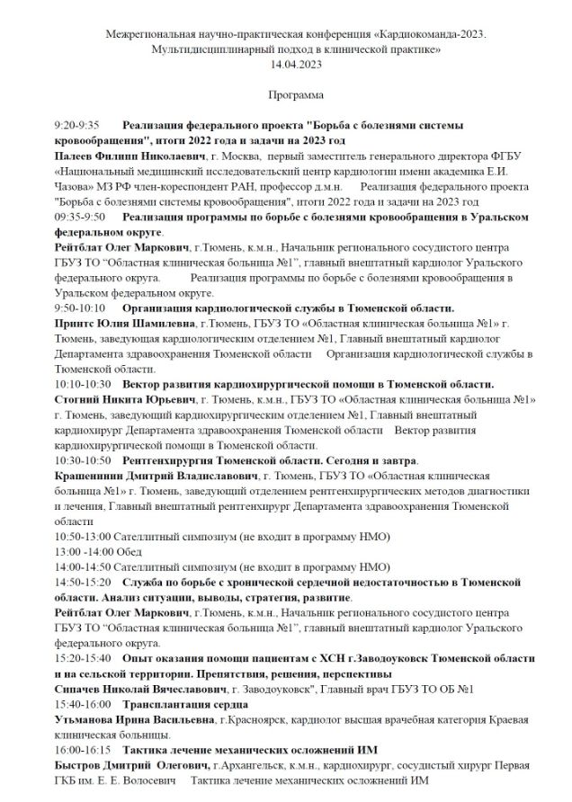Межрегиональная научно-практическая конференция «Кардиокоманда-2023. Мультидисциплинарный подход в клинической практике» Дата проведения: 14 апреля 2023 года Местопроведения: г. Тюмень, ул. Советская, 20, Бизнес-Отель «Евразия». Сателлитный симпозиум (не входит в программу НМО)