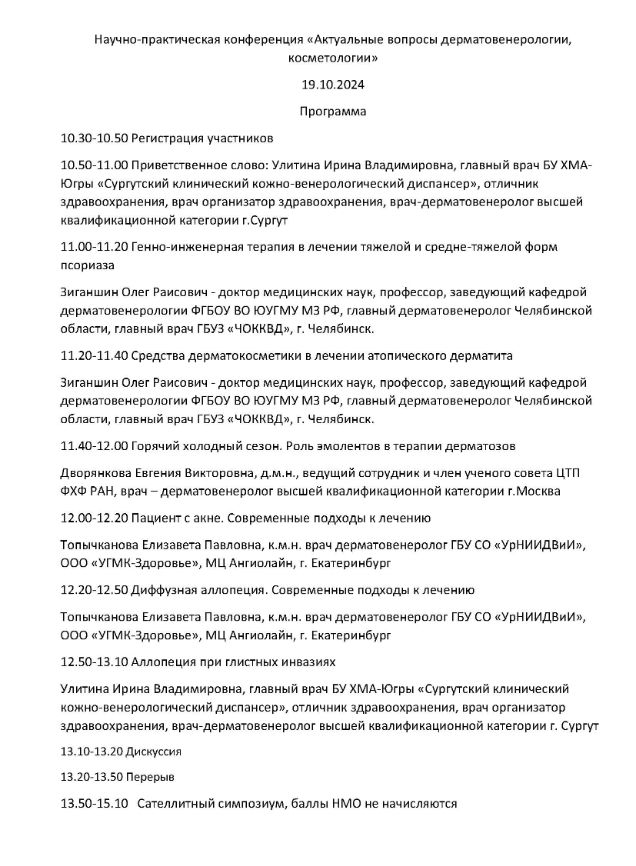 Научно-практическая конференция " Актуальные вопросы дерматовенерологии, косметологии. Дата проведения: 19 октября 2024 г. Место проведения: г. Сургут, просп. Ленина, 43, отель Сити Сателлитный симпозиум, не входит в программу НМО