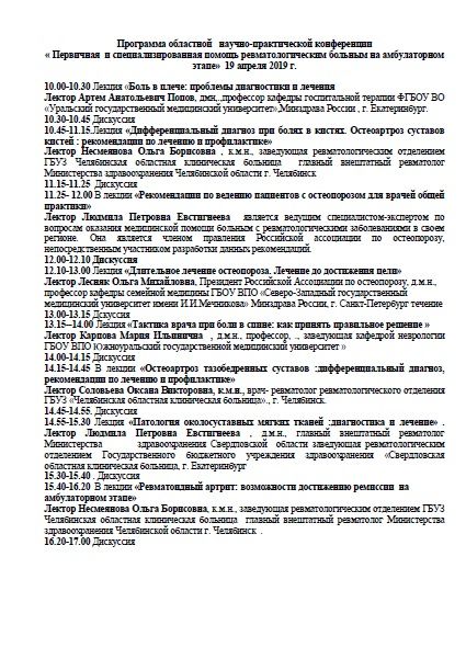 Научно-практическая конференция « Первичная и специализированная помощь ревматологическим больным на амбулаторном этапе» Дата проведения: 19 апреля 2019 г. Место проведения: г. Челябинск, ул. Труда, 179, Отель Редиссон