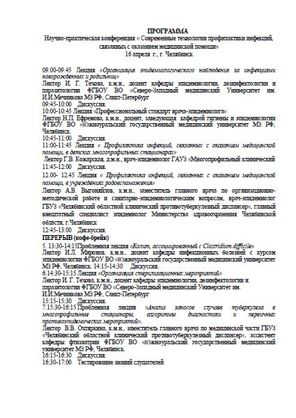 Научно-практическая конференция « Современные технологии профилактики инфекций, связанных с оказанием медицинской помощи» Дата проведения: 16 апреля 2018г. Место проведения: г. Челябинск, Лесопарковая, 6, отель «Парк-Сити»