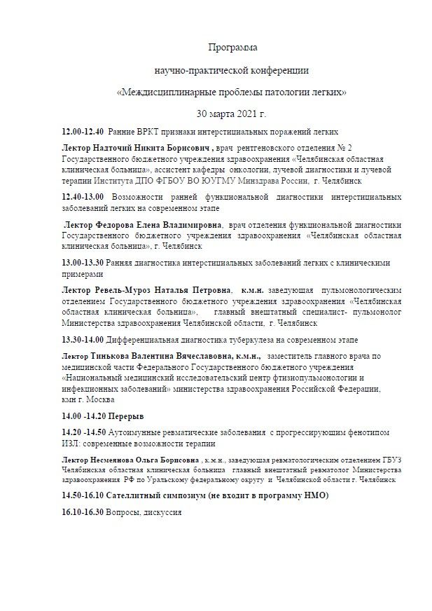 Научно-практическая конференция «Междисциплинарные проблемы патологии легких» |