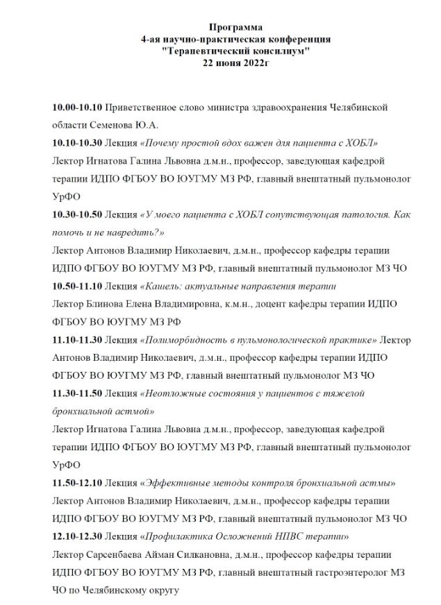 4-ая научно-практическая конференция "Терапевтический консилиум. Трудные и нерешенные проблемы" Дата проведения: 22 июня 2022 года Место проведения: г. Челябинск, ул. Лесопарковая, 6, Отель «Парк Сити» Сателлитный симпозиум (не входит программу НМО)