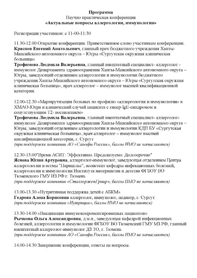 Научно практическая конференция «Актуальные вопросы аллергологии, иммунологии» Дата проведения: 13 декабря 2025 года Место проведения: г. Сургут, «Метропоилис», Набережный проспект 13/1, конференц зал