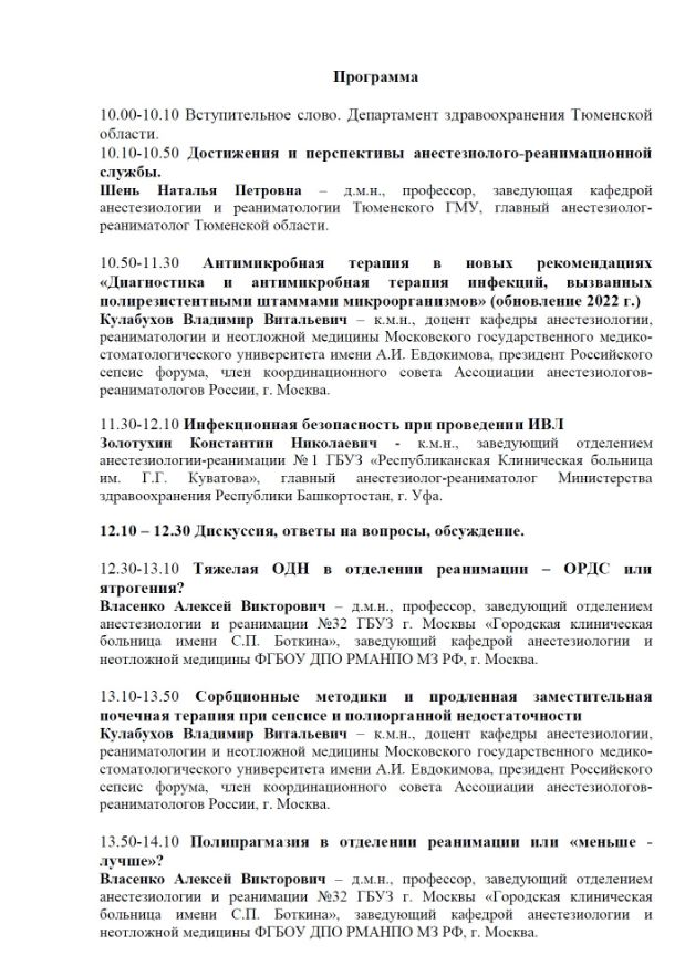 Научно-практическая конференция «Актуальные проблемы анестезиологии и реаниматологии Тюменской области» Дата проведения: 18 марта 2023 года Место проведения: г. Тюмень, ул. Грибоедова, 6к1/7, Отель «Ремезов»