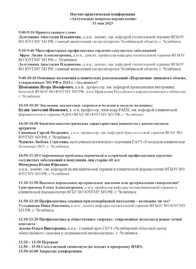 Научно-практическая конференция «Актуальные вопросы кардиологии» Дата проведения: 11 мая 2023 года Место проведения: г. Челябинск, ул. Труда, 153, Отель «Малахит». Сателлитный симпозиум (не входит в программу НМО)