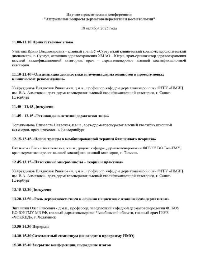 Научно-практическая конференция "Актуальные вопросы дерматовенерологии и косметологии" Дата проведения: 10 октябяр 2025 г. Место проведения: г. Сургут, пр. Ленина, 43 «Сити Центр» Сателлитный симпозиум (не входит в программу НМО)