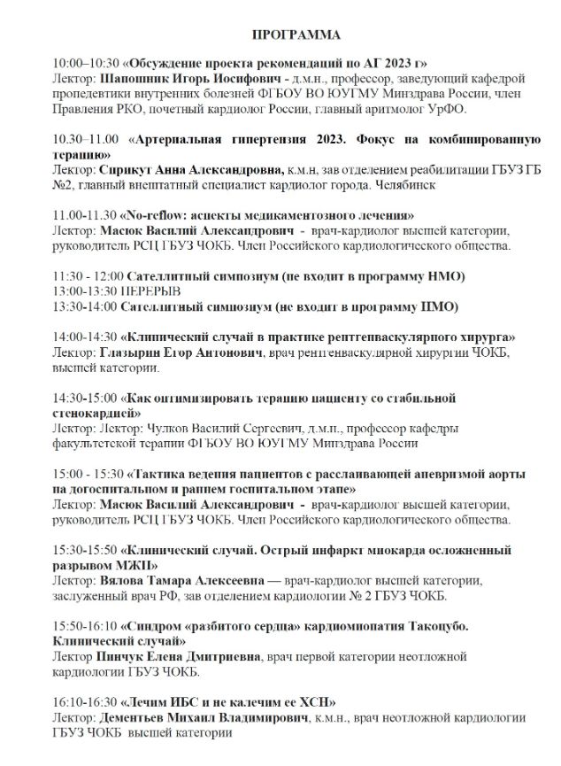 Научно-практическая конференция «Актуальные вопросы кардиологии» Дата проведения: 3 марта 2023 года. Место проведения: г. Челябинск, ул. Лесопарковая, 6, Бизнес-Отель «Парк Сити» Сателлитный симпозиум (не входит в программу НМО)