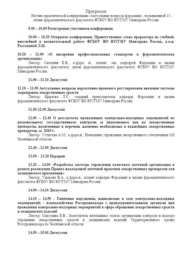 Научно-практическая конференция «Актуальные вопросы фармации», посвященная 15-летию фармацевтического факультета ФГБОУ ВО ЮУГМУ Минздрава России |