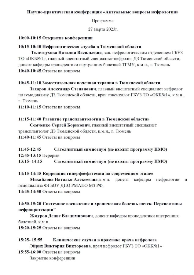Научно-практическая конференция «Актуальные вопросы нефрологии» Дата проведения: 27 марта 2023 года Место проведения: г. Тюмень, ул.Котовского 55, ГБУЗ ТО «ОКБ №1», конференц-зал Сателлитный симпозиум (не входит программу НМО)