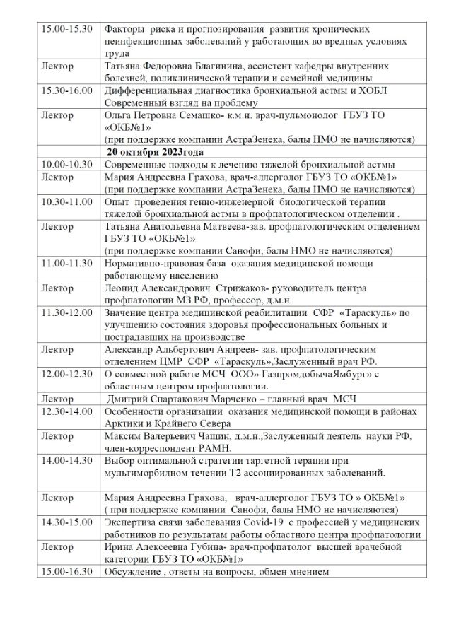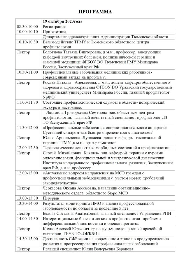 Научно-практическая конференция «Актуальные вопросы профпатологии» Дата проведения: 19-20 октября 2023 года. Место проведения: г. Тюмень, улица Юрия Семовских, 10, Конференц-зал ГБУЗ ТО «Областная клиническая больница №1»