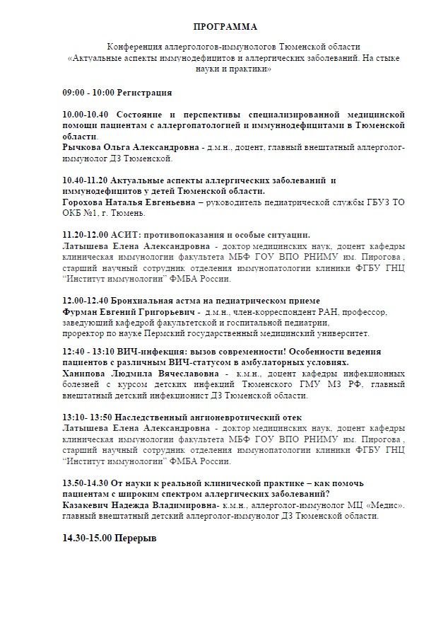 Научно-практическая конференция аллергологов-иммунологов Тюменской области «Актуальные аспекты иммунодефицитов и аллергических заболеваний. На стыке науки и практики» |