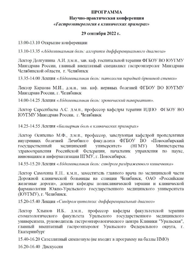 Научно-практическая конференция «Гастроэнтерология в клинических примерах» Дата проведения: 29 сентября 2022 года Место проведения: г. Челябинск ул. Лесопарковая, 6, отель ПаркСити Сателлитный симпозиум (не входит в программу для НМО)
