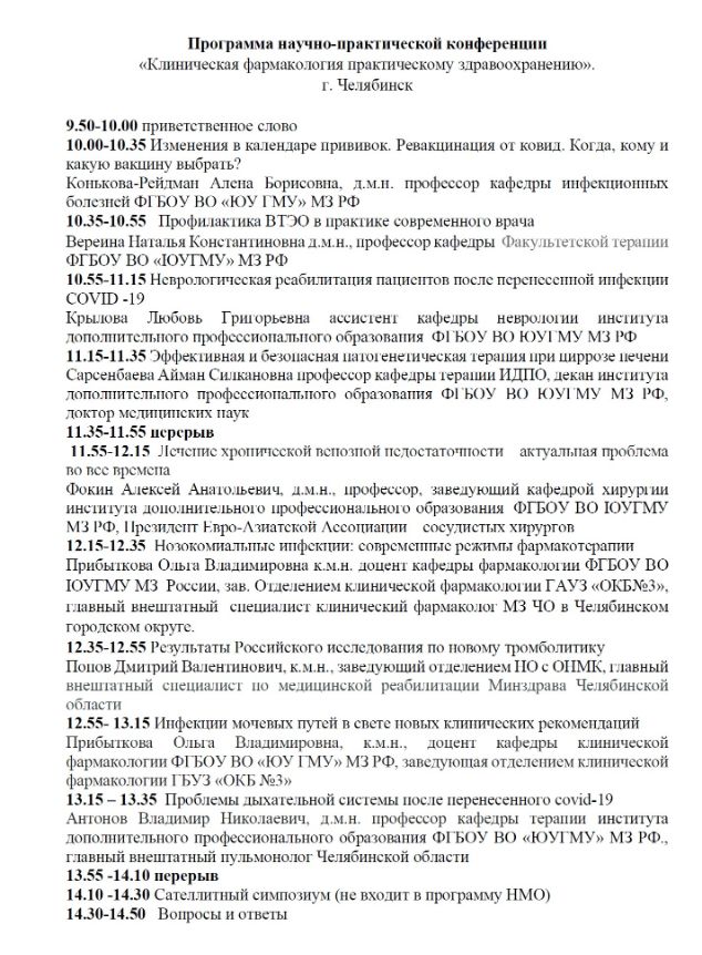 Научно-практическая конференция «Клиническая фармакология практическому здравоохранению» Дата проведения: 1 октября 2022 г. Место проведения: г. Челябинск, ул. Лесопарковая 6, Отель «Парк Сити» Сателлитный симпозиум (не входит в программу НМО)