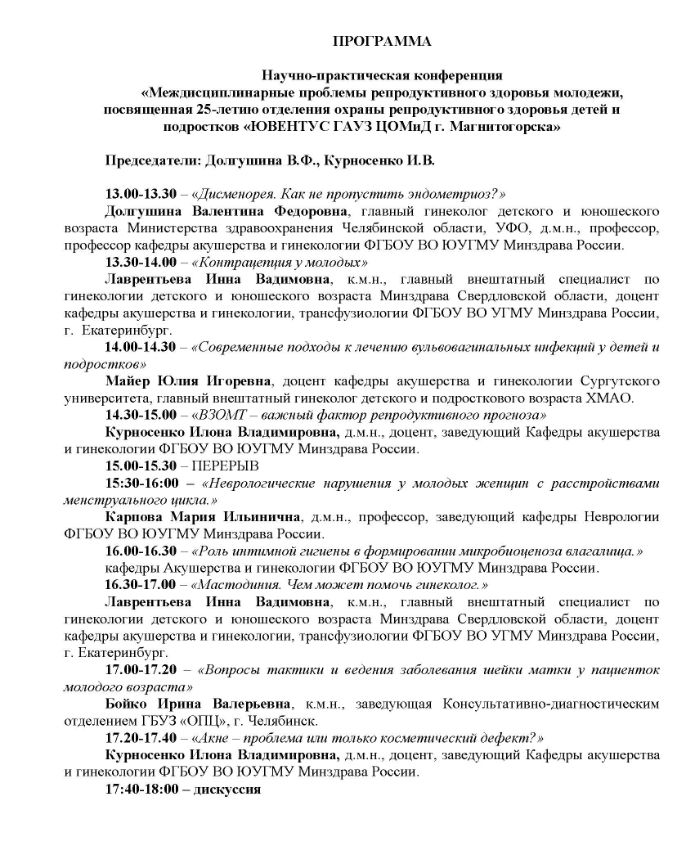 Научно-практическая конференция «Междисциплинарные проблемы репродуктивного здоровья молодежи, посвященная 25-летию отделения охраны репродуктивного здоровья детей и подростков «ЮВЕНТУС ГАУЗ ЦОМиД г. Магнитогорска» |