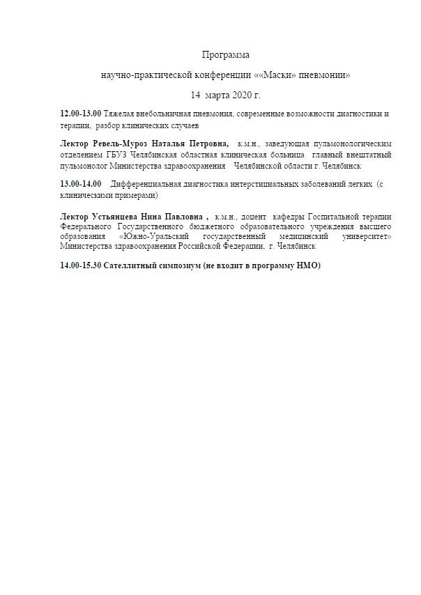 Научно-практическая конференция ««Маски» пневмонии» Дата проведения: 14 марта 2020 г. Место проведения: г. Магнитогорск, проспект Ленина 130, отель «Форум» Сателлитный симпозиум (не входит в программу НМО)