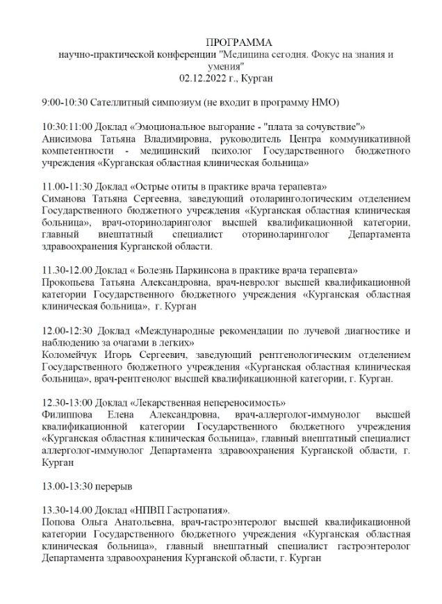 Научно-практическая конференция "Медицина сегодня. Фокус на знания и умения" Дата проведения: 2 декабря 2022 года Место проведения: г. Курган, ул. Гоголя, 30, ГБУК "Курганский областной культурно-выставочный центр" Сателлитный симпозиум (не входит в программу НМО)