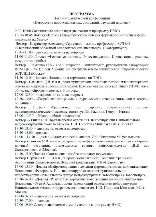 Научно-практическая конференция «Неврология пароксизмальных состояний. Трудный пациент» Дата проведения: 22 марта.2024 года Место проведения: г. Екатеринбург, ул. Энгельса, 7, отель «Новотель» Сателлитный симпозиум (не входит в программу НМО)