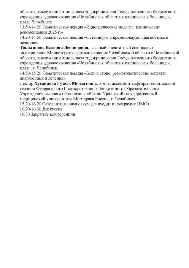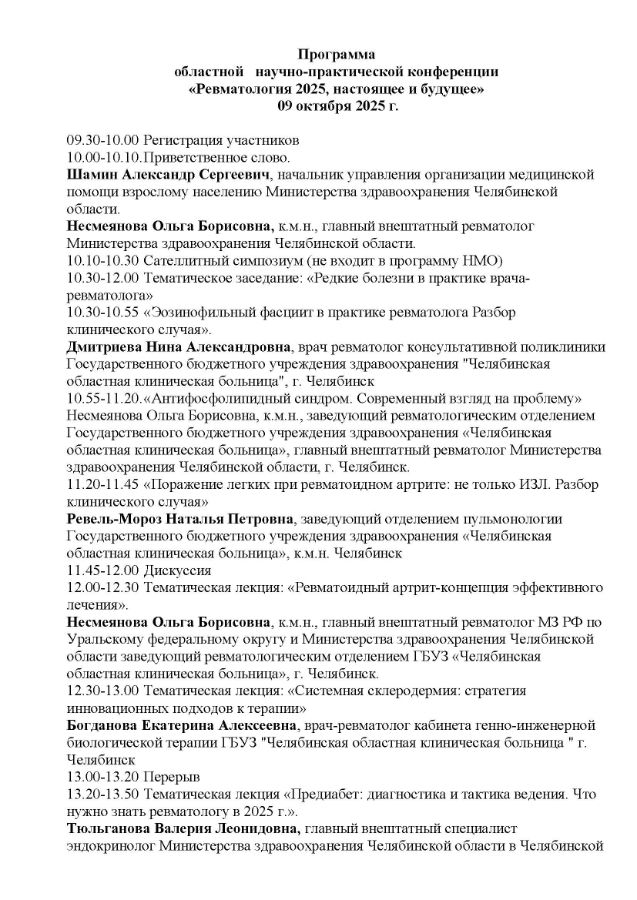 Областная научно-практическая конференция «Ревматология 2025: настоящее и будущее» Дата проведения: 09 октября 2025 г. Место проведения: г. Челябинск, ул. Лесопарковая, 6, отель ПаркСити Сателлитный симпозиум (не входит в программу НМО)