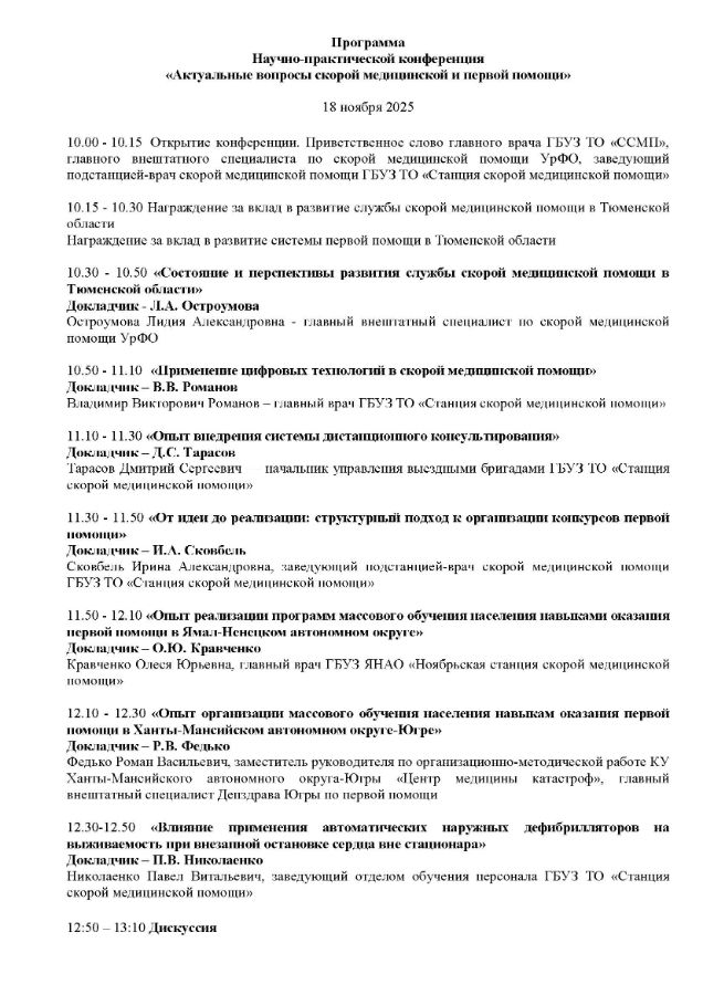 Научно-практическая конференция «Актуальные вопросы скорой медицинской и первой помощи» Дата проведения: 18 ноября 2025 г. Место проведения: г. Тюмень, ул. Советская, 20, Отель «Евразия»