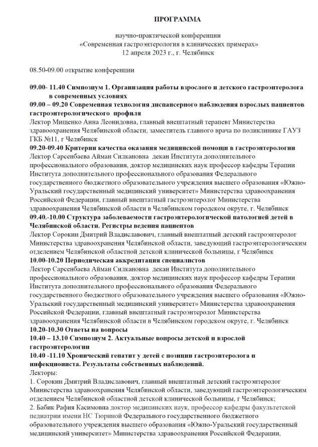 Научно-практическая конференция «Современная гастроэнтерология в клинических примерах» Дата проведения: 12 апреля 2023 года Место проведения: г. Челябинск, ул. Лесопарковая, 6, Бизнес-Отель «Парк Сити». Сателлитный симпозиум (не входит в программу НМО)