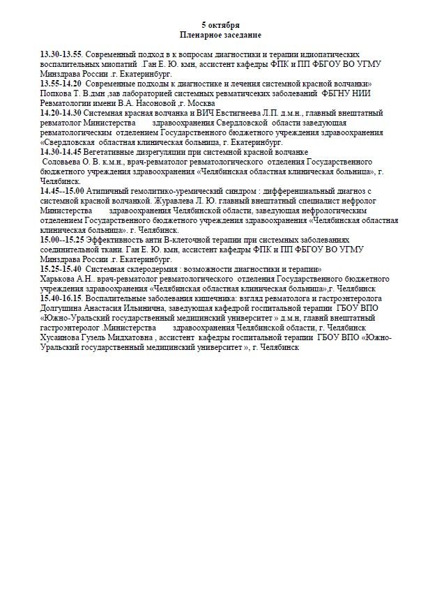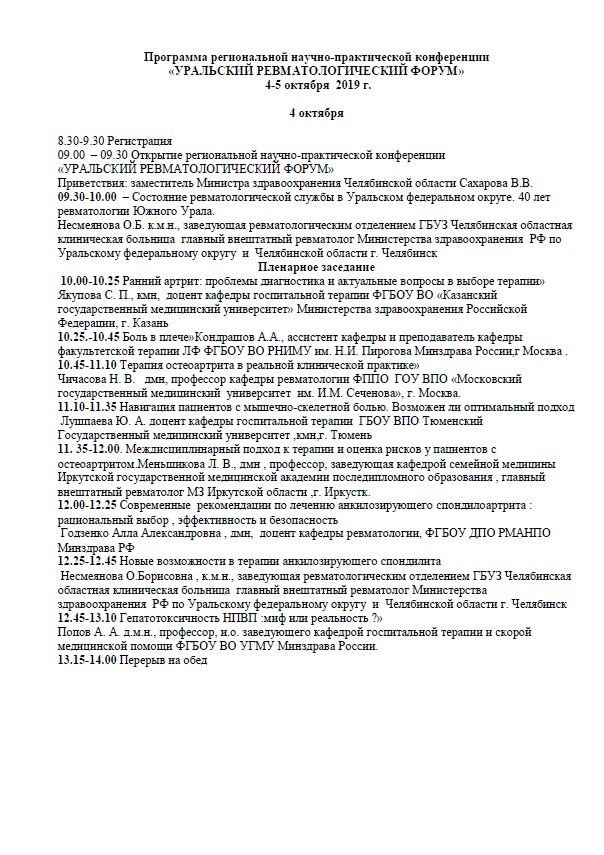 Научно-практическая конференция «Уральский ревматологический форум» Место проведения: г. Челябинск, ул. Труда, 153, Отель Малахит Дата проведения: 4-5 октября 2019 г. Сателлитный симпозиум (не входит в программу для НМО