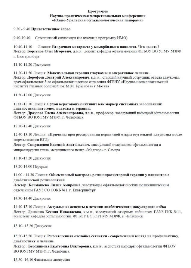 Научно-практическая межрегиональная конференция «Южно-Уральская офтальмологическая панорама» Дата проведения: 22 ноября 2025 г. Место проведения: г. Челябинск ул. Труда, 153, отель Малахит Сателлитный симпозиум (не входит в программу НМО)