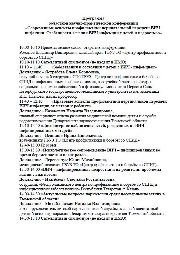 Областная научно-практическая конференция «Современные аспекты профилактики перинатальной передачи ВИЧ-инфекции. Особенности лечения ВИЧ-инфекции у детей и подростков» |