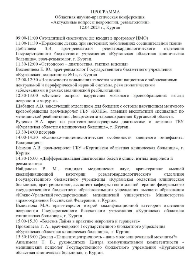 Областная научно-практическая конференция «Актуальные вопросы неврологии, ревматологии» Дата проведения: 12 аппреля 2023 года Место проведения: г. Курган, ул. Томина д. 63, актовый зал КОКБ Сателлитный симпозиум (не входит в программу НМО)