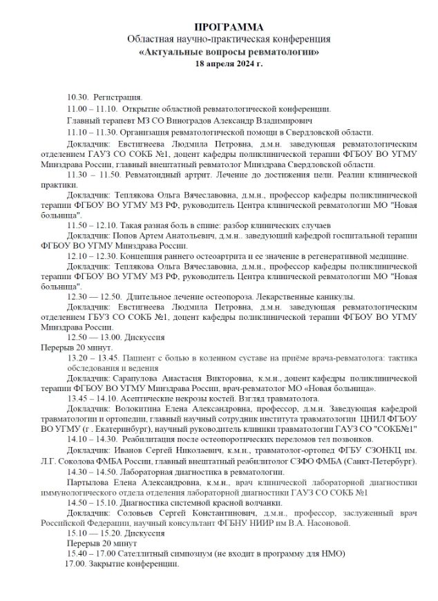 Областная научно-практическая конференция «Актуальные вопросы ревматологии» Дата проведения: 18 апреля 2024 г. Место проведения: г. Екатеринбург, ул. Московская, 131, Отель «Московская горка». Сателлитный симпозиум (не входит в программу для НМО)