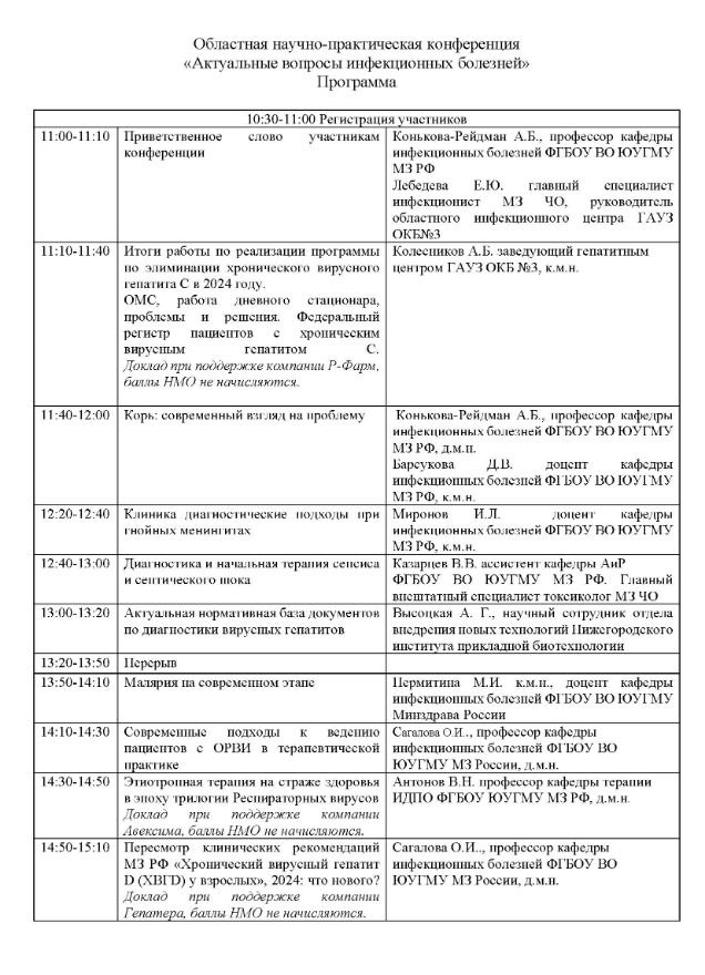 Областная научно-практическая конференция «Актуальные вопросы инфекционных болезней» Дата проведения: 20 ноября 2024 г. Место проведения: г. Челябинск, ул. Лесопарковая 6, Отель «Парксити»