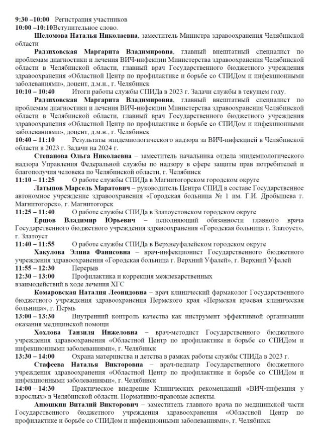 Областная научно-практическая конференция по итогам работы службы СПИДа в Челябинской области за 2023 год Дата проведения: 22 февраля 2024 года Место проведения: г. Челябинск, ул. Труда, 153, Отель «Малахит» ПРОГРАММА