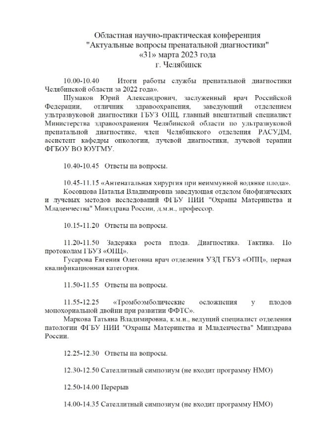 Областная научно-практическая конференция "Актуальные вопросы пренатальной диагностики" Дата проведения: 31 марта 2023 года. Место проведения: г. Челябинск, ул. Лесопарковая, 6, Бизнес-Отель «Парк Сити». Сателлитный симпозиум (не входит программу НМО)