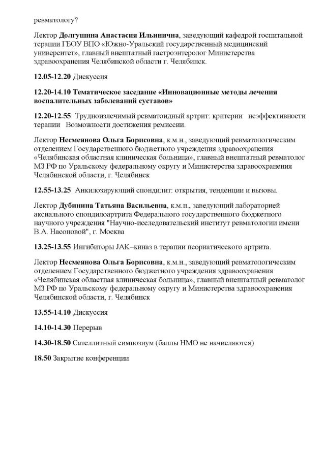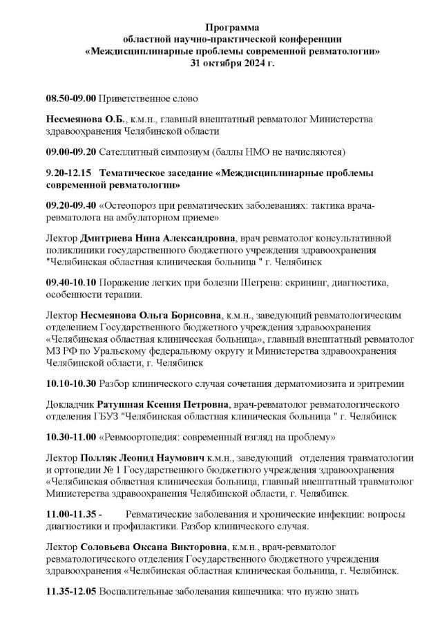 Областная научно-практическая конференция «Междисциплинарные проблемы современной ревматологии» Дата проведения: 31 октября 2024 г. Место проведения: г. Челябинск, ул. Лесопарковая, 6, отель «ПаркСити» Сателлитный симпозиум (баллы НМО не начисляются)