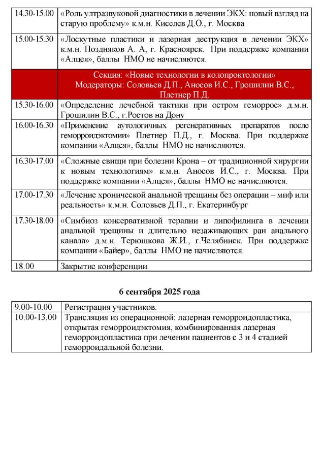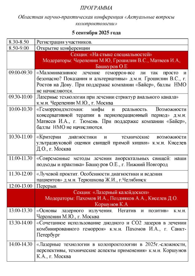 Областная научно-практическая конференция «Актуальные вопросы колопроктологии» Дата проведения: 5-6 сентября 2025 года Место проведения: г. Челябинск, ул. Труда, 179, Бизнес-отель «Redisson Blu»