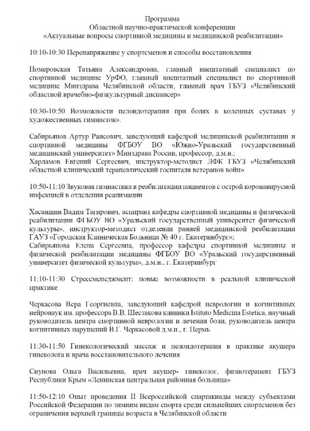 Областная научно-практическая конференция «Актуальные вопросы спортивной медицины и медицинской реабилитации» Дата проведения: 18 сентября 2024 года Место проведения: г. Челябинск, ул. Лесопарковая, 6, отель Парксити