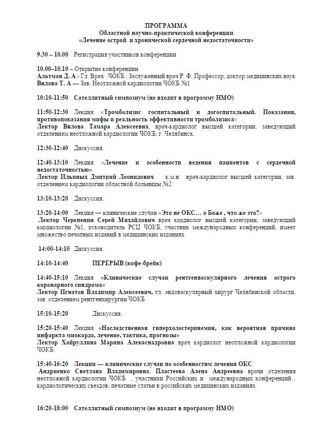 Областная научно-практическая конференция «Лечение острой и хронической сердечной недостаточности» Дата проведения:13 марта 2020 г. Место проведения: г. Челябинск, ул. Воровского 70, конференц-зал ЧОКБ Сателлитный симпозиум (не входит в программу НМО)