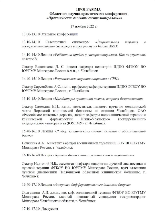 Областная научно-практическая конференция «Практические аспекты гастроэнтерологии» Дата проведения: 17 ноября 2022 года. Место проведения: г. Челябинск ул. Лесопарковая, 6, отель ПаркСити Сателлитный симпозиум «Рациональная терапия в гастроэнтерологии» (не входит в программу на баллы НМО)