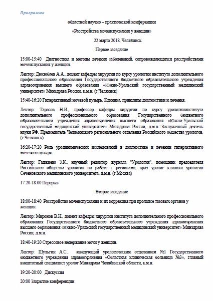 Областная научно-практическая конференция «Расстройства мочеиспускания у женщин» Дата проведения: 22 марта 2018 года. Место проведения: г. Челябинск, ул. Труда, 153, конгресс-отель «Малахит»