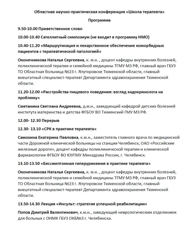 Областная научно-практическая конференция «Школа терапевта» Дата проведения: 24 мая 2023 года Место проведения: г. Тюмень, ул. Советская, д. 20, Бизнес-отель «Евразия» Сателлитный симпозиум (не входит в программу НМО)