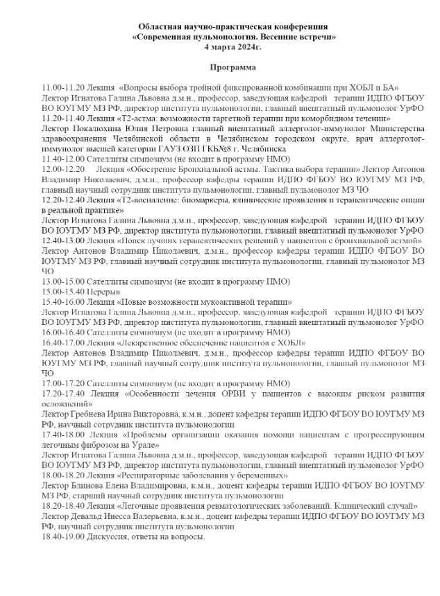 Областная научно-практическая конференция «Современная пульмонология. Весенние встречи» Дата проведения: 04 марта 2024 года Место проведения: г. Челябинск, ул. Труда 153, Отель «Малахит» Сателлиты симпозиум (не входит в программу НМО)