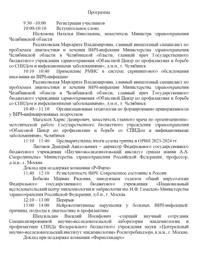 Областной научно-практической конференции «ВИЧ-инфекция:Современное понимание проблемы» Дата проведения: 3 мая 2024 года Место проведения: г. Челябинск, ул. Труда, 153, Отель «Малахит»